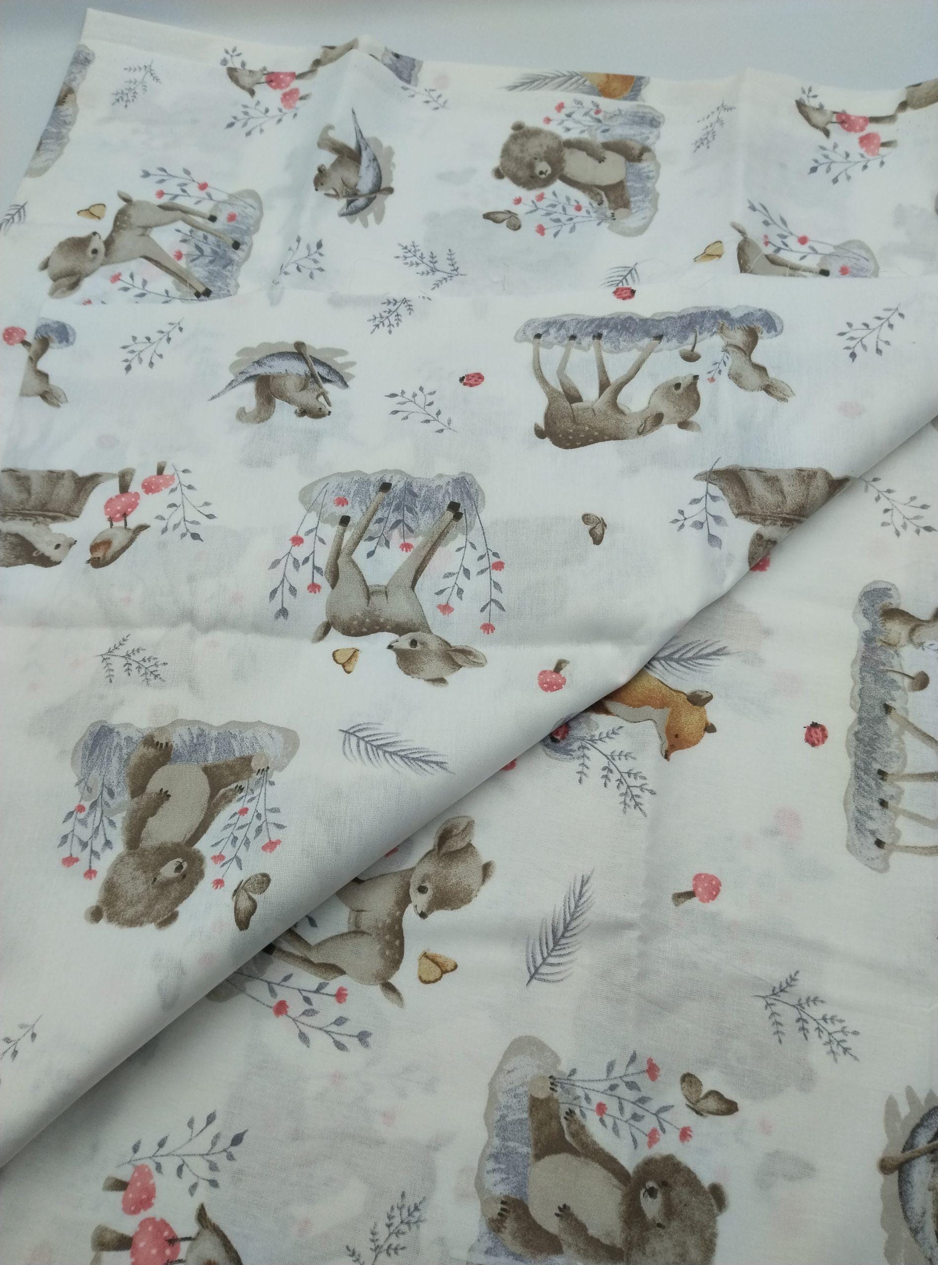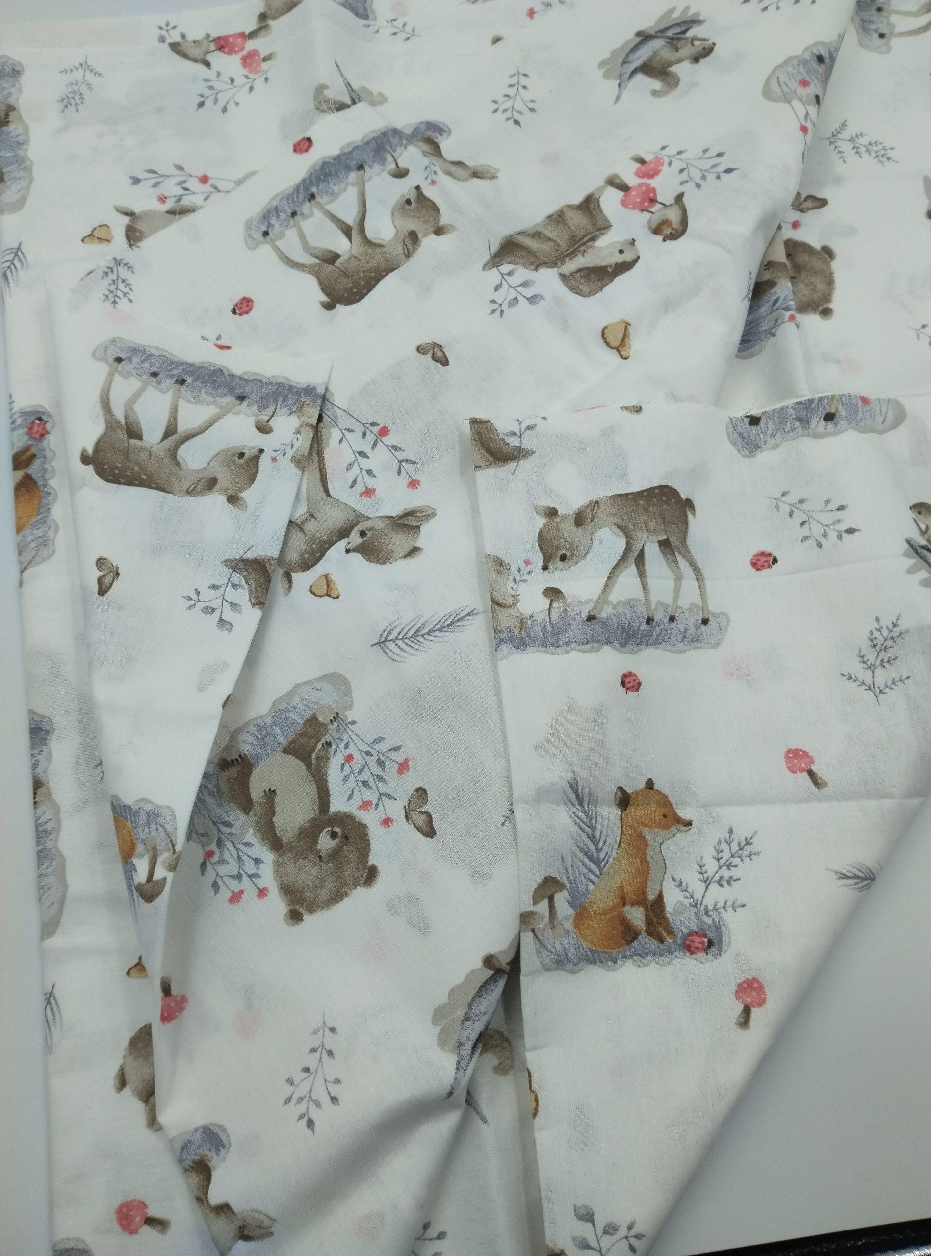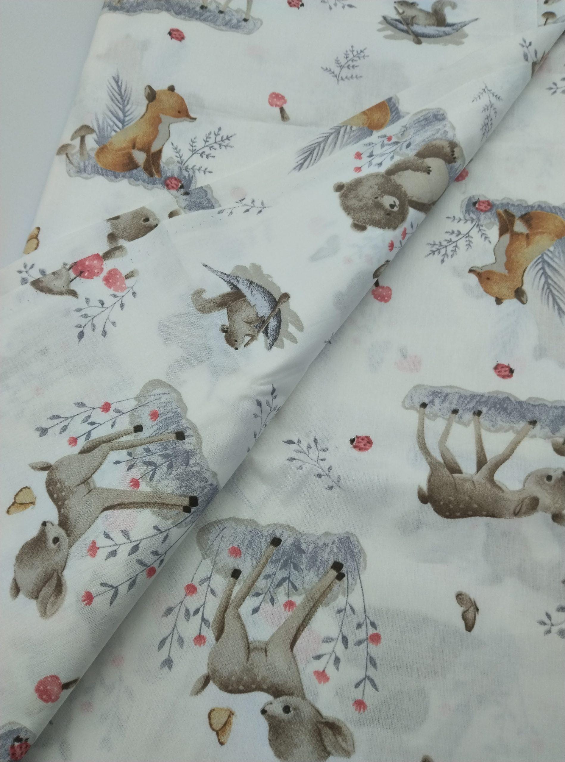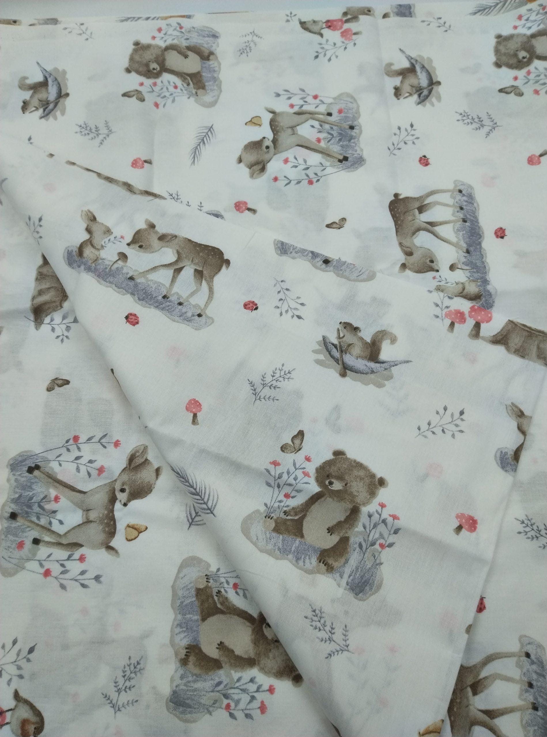 ELNA Kumaş’ın orman hayvanları desenli viskon‑pamuk kumaşı; ayılar, geyikler, tavşanlar gibi sevimli motiflerle süslenmiş, hafif ve nefes alabilen yapısı sayesinde bebek kıyafetleri, elbiseler, bluzlar, etekler ve kreş dekorasyon projeleri için ideal. Yumuşak dokusu cilde dosttur ve dökümlü akışıyla kullanımı kolaydır.