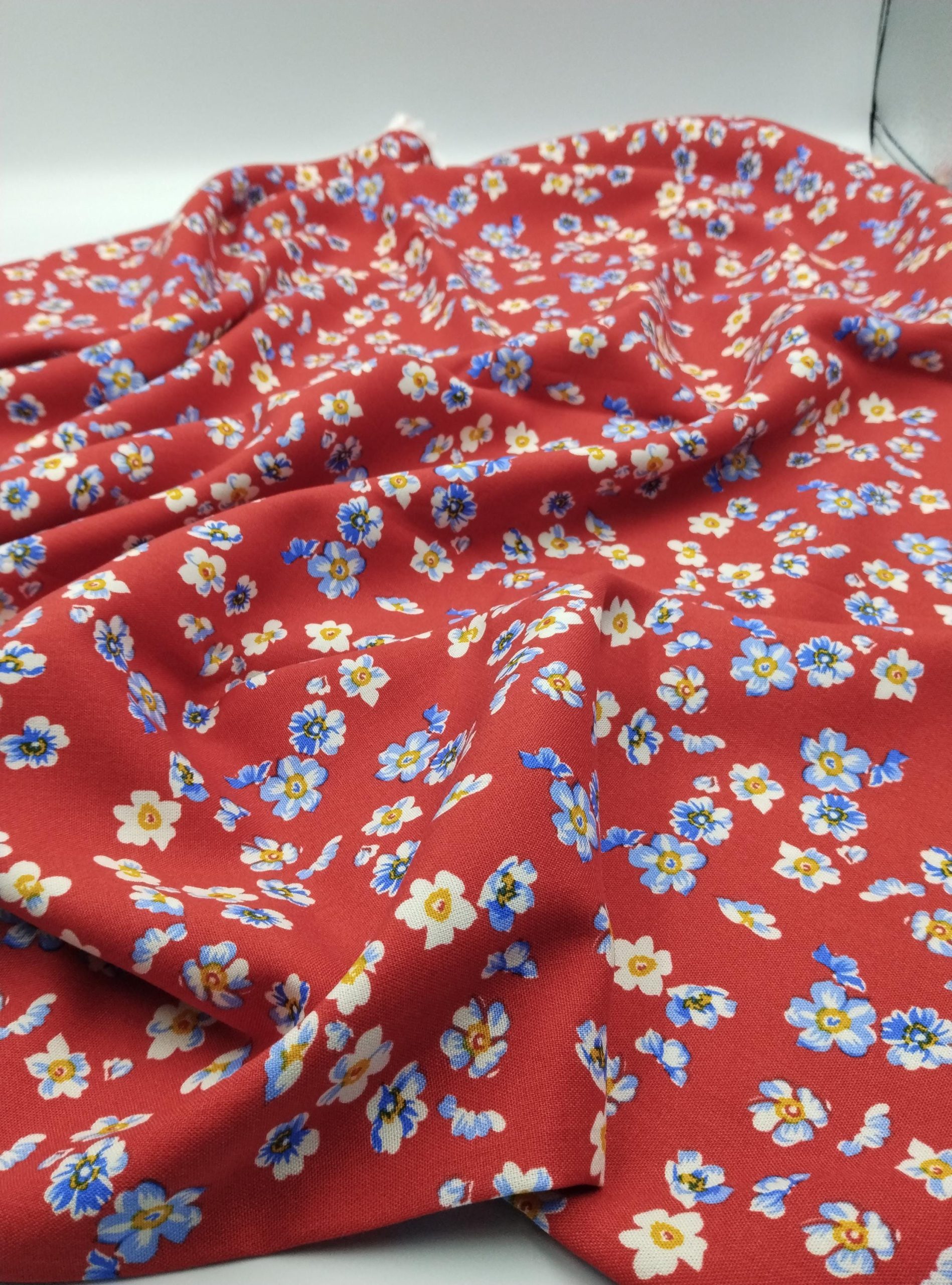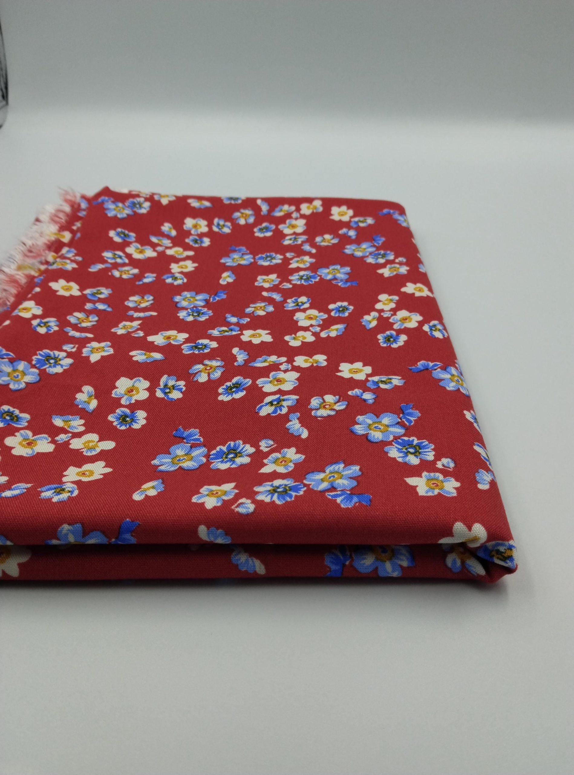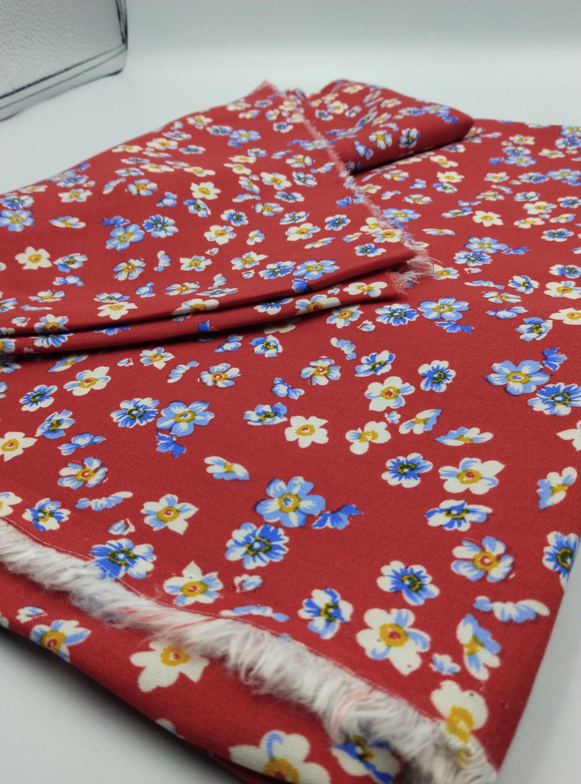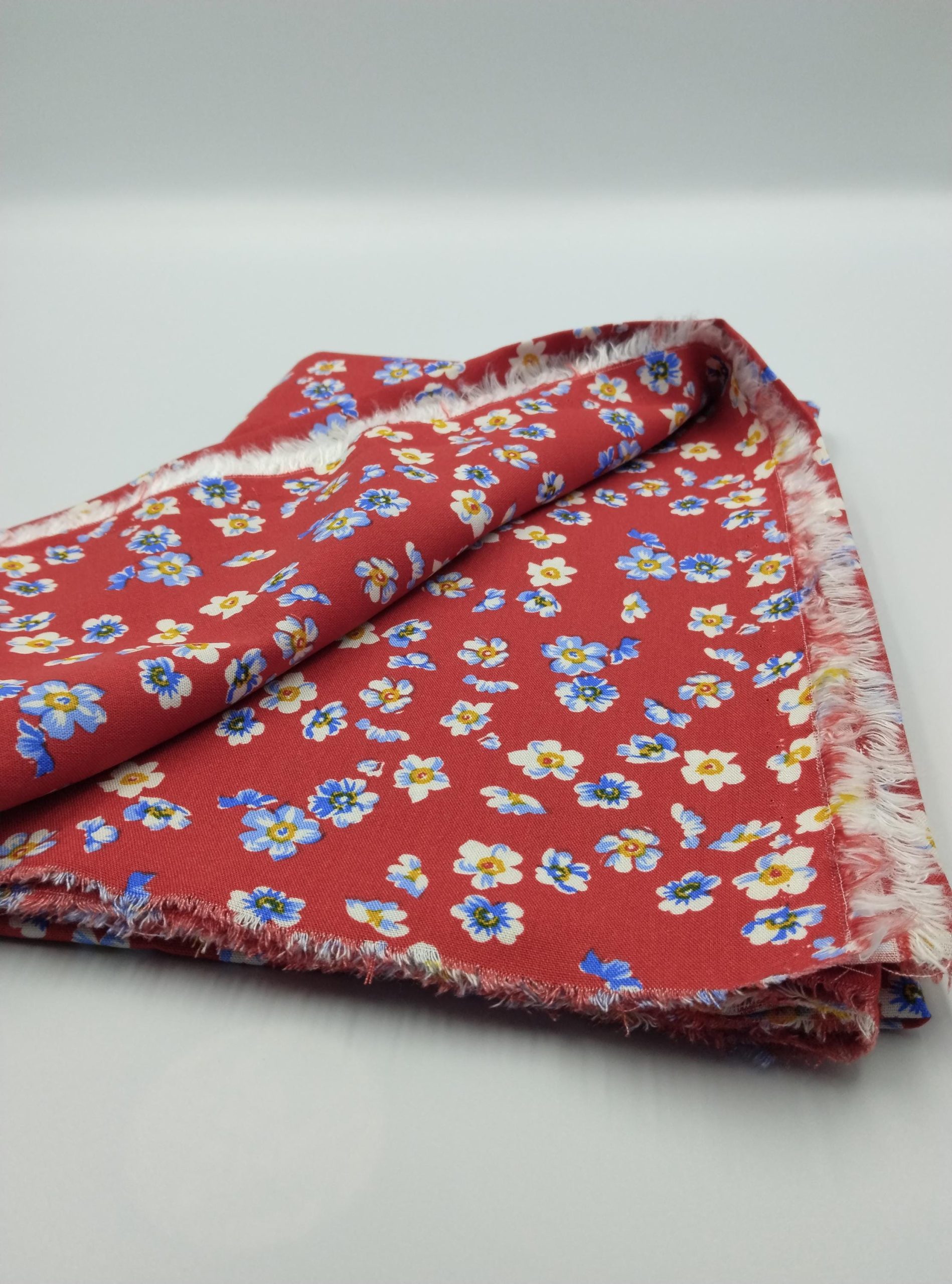 ELNA Kumaş’ın kırmızı zemin üzerine mavi ve beyaz çiçek desenli viskon‑pamuk karışımı; hafif, drapeli ve nefes alan özellikleri ile elbiseler, bluzlar, etekler, tunikler ve hafif pantolonlar için ideal. Yumuşak dokusu ve akışkan yapısı sayesinde hem gündelik kullanımda hem de özel tasarımlarda konfor ve şıklık sağlar.