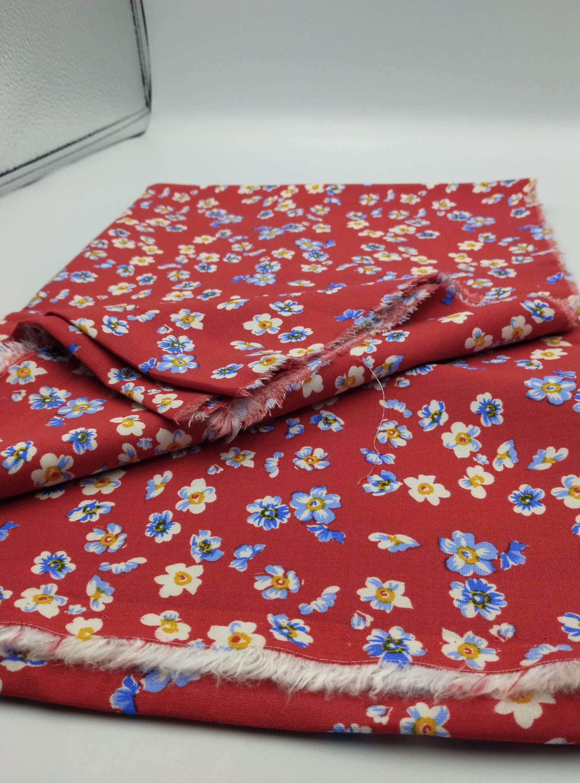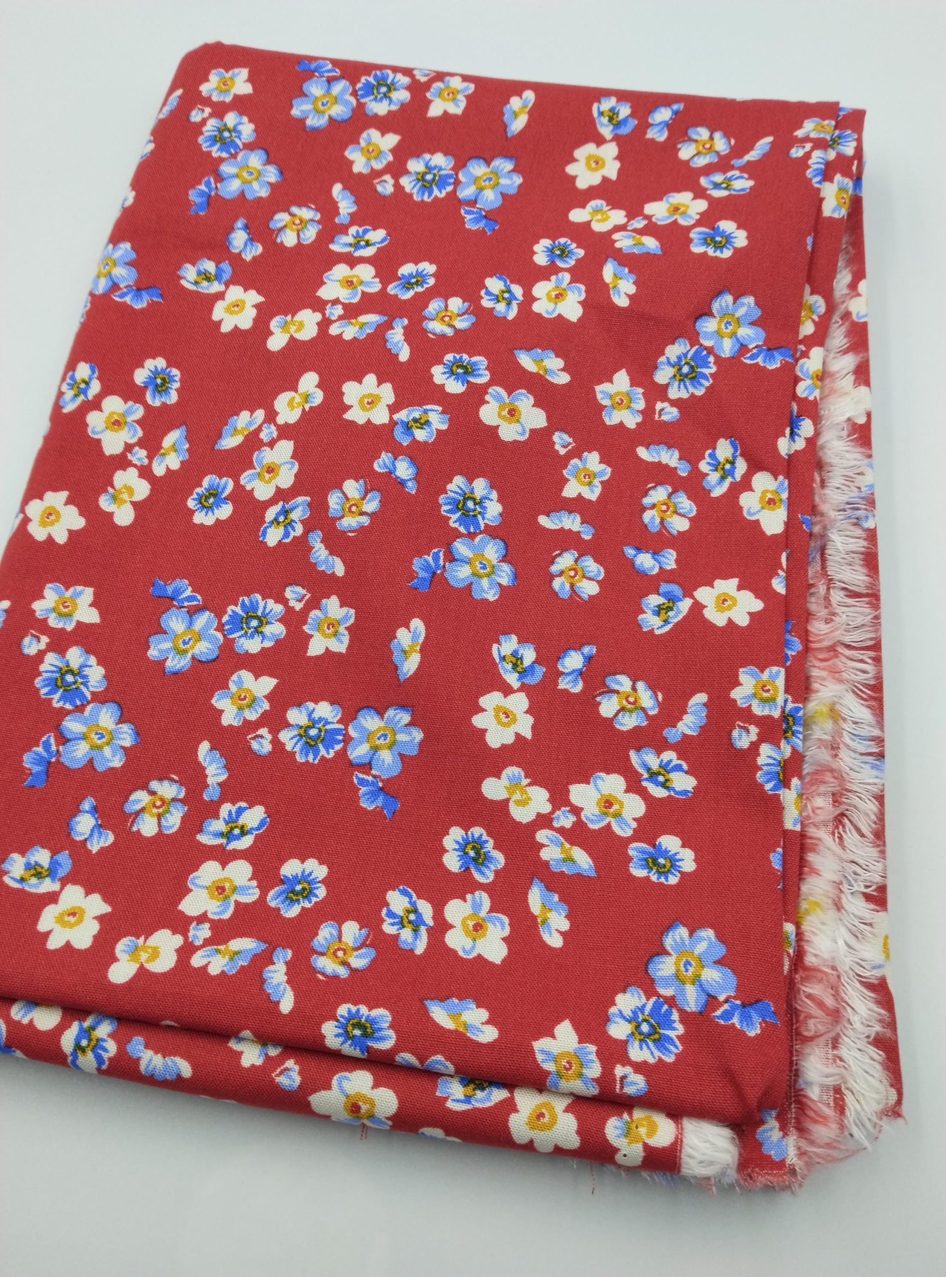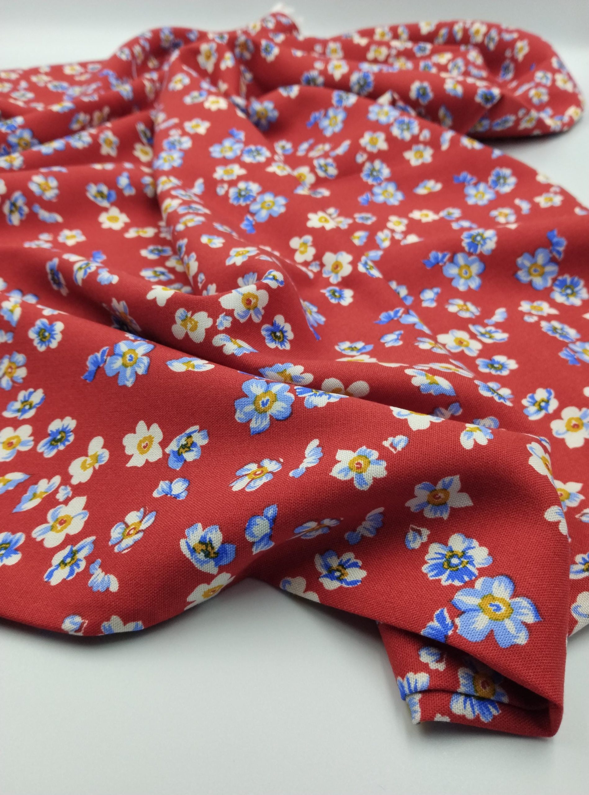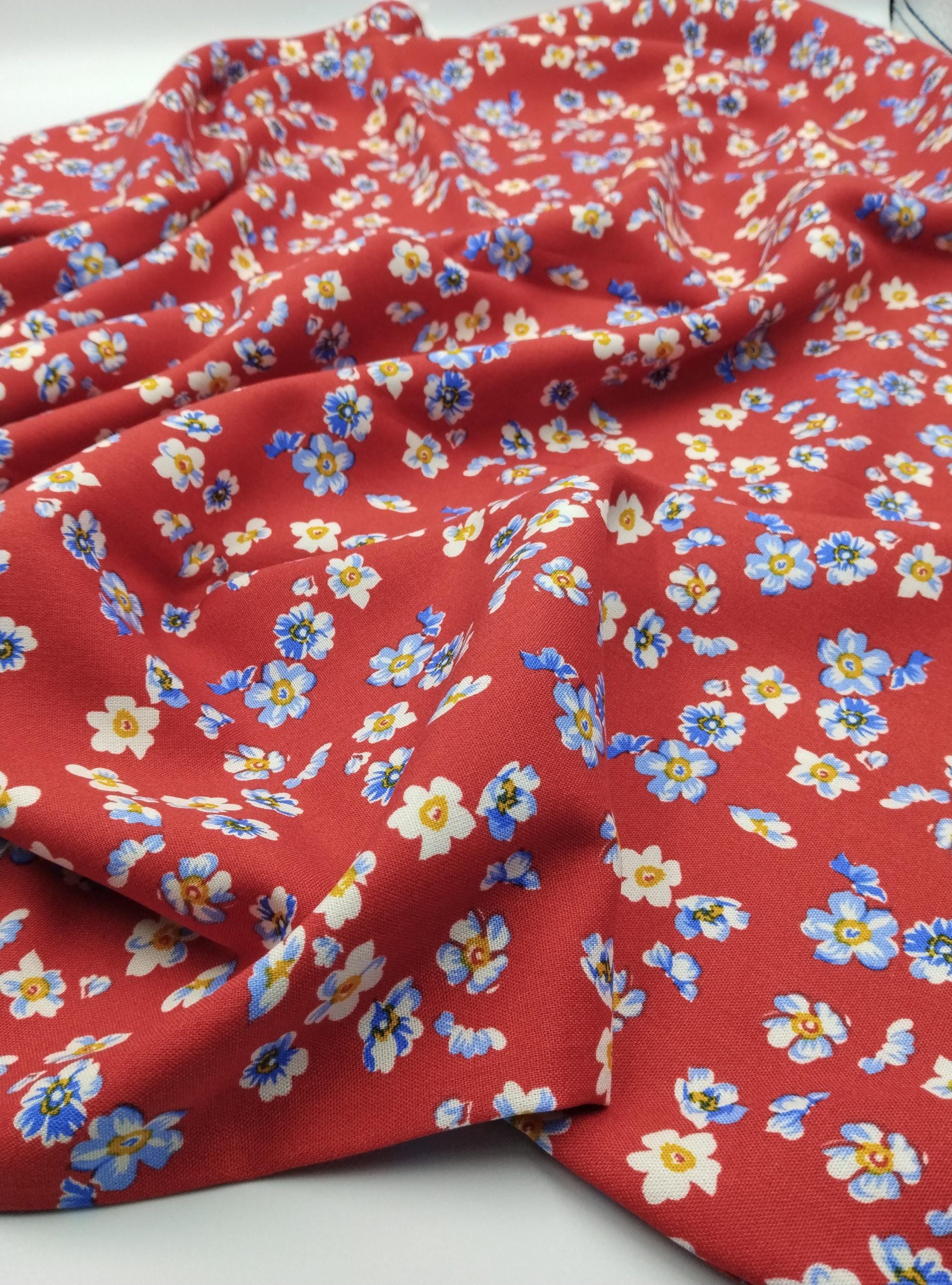 ELNA Kumaş’ın kırmızı zemin üzerine mavi ve beyaz çiçek desenli viskon‑pamuk karışımı; hafif, drapeli ve nefes alan özellikleri ile elbiseler, bluzlar, etekler, tunikler ve hafif pantolonlar için ideal. Yumuşak dokusu ve akışkan yapısı sayesinde hem gündelik kullanımda hem de özel tasarımlarda konfor ve şıklık sağlar.