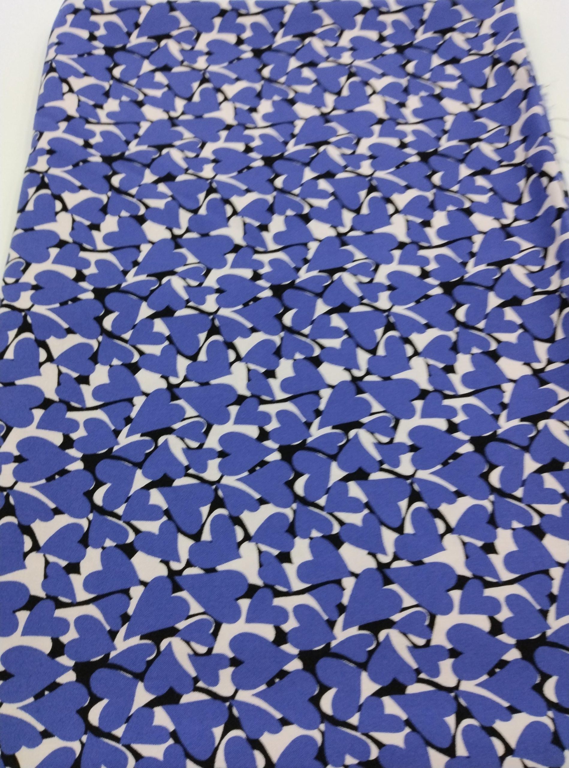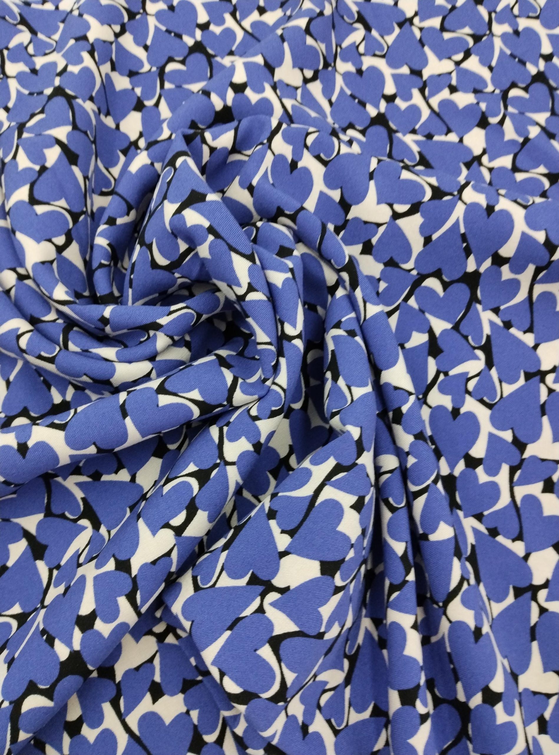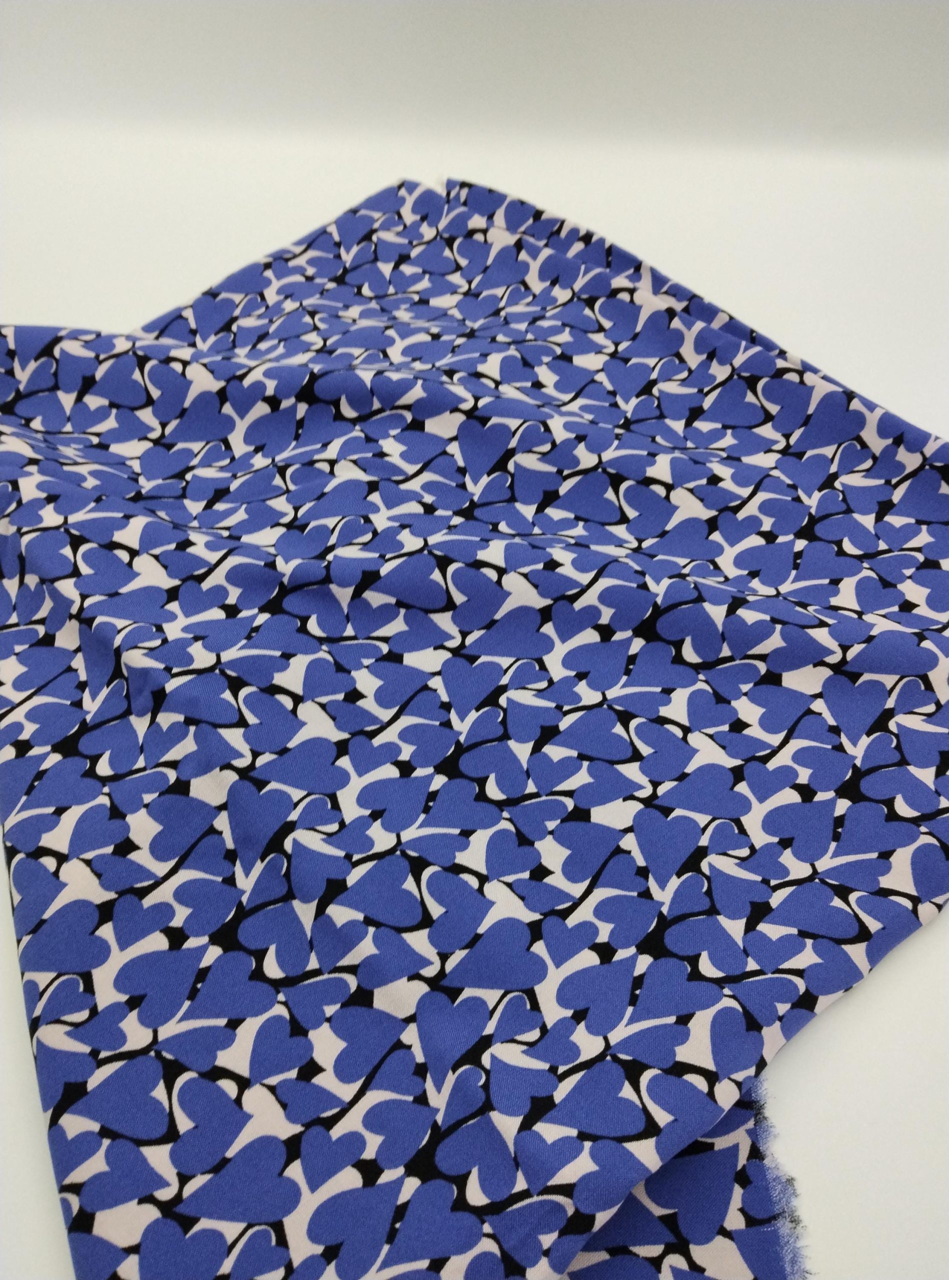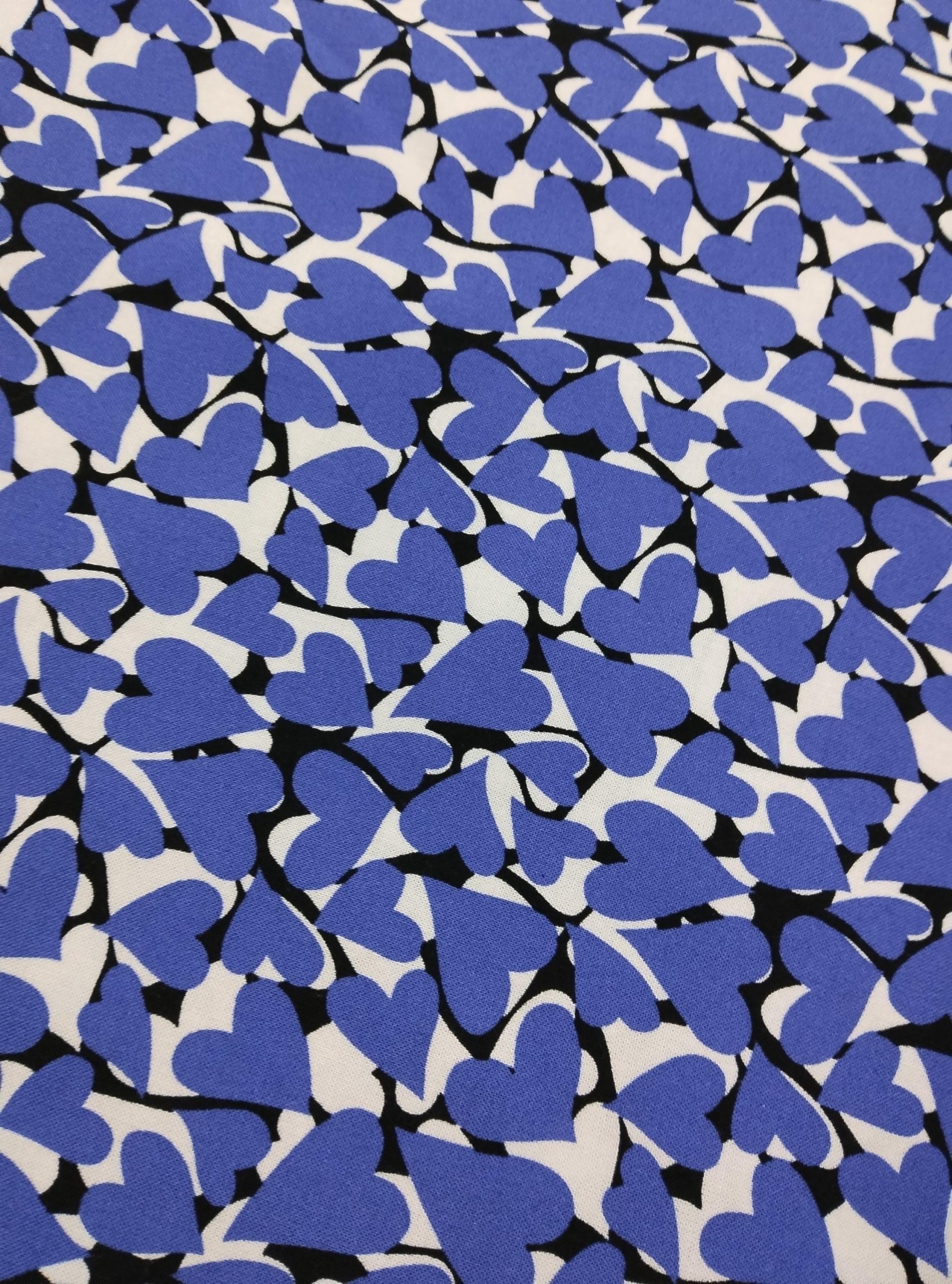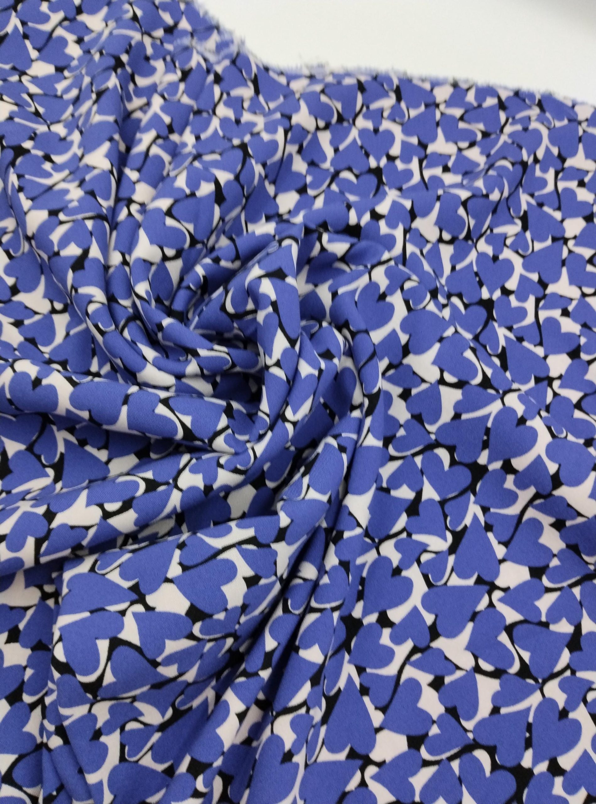 Mavi kalp desenli pamuk‑viskon karışımı kumaş; siyah ve beyaz zemin üzerinde enerjik bir tasarıma sahip. Hafif ve yumuşak dokusuyla yazlık elbiseler, bluzlar ve etekler için ideal. Drapajı güzel, nefes alabilir yapısı sayesinde konfor sunar. Birden fazla metre siparişlerinde kumaş tek parça olarak gönderilir.
