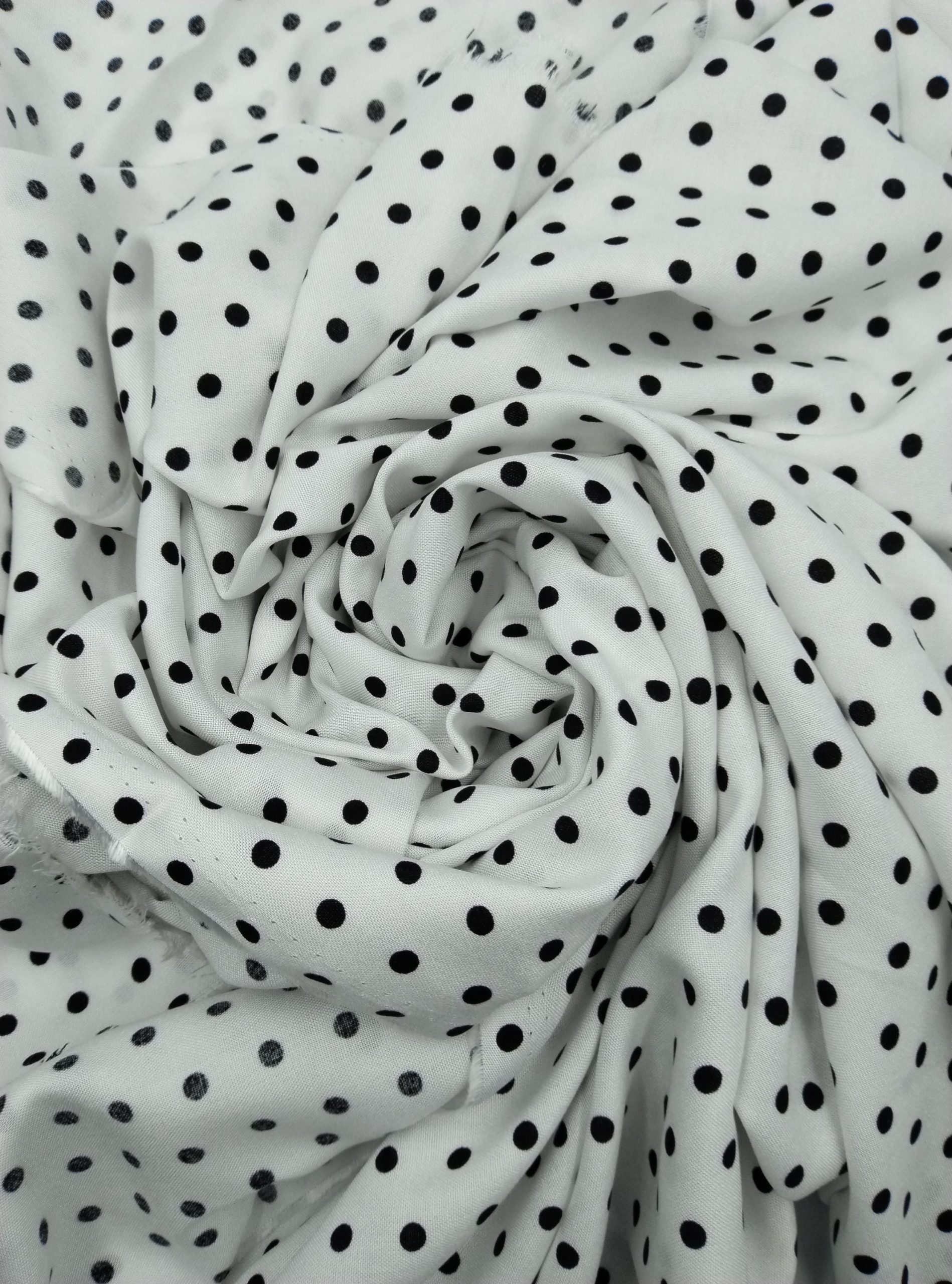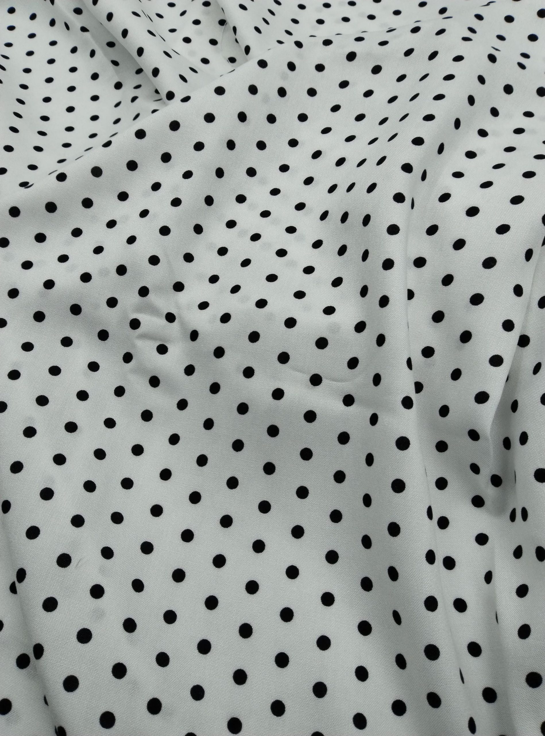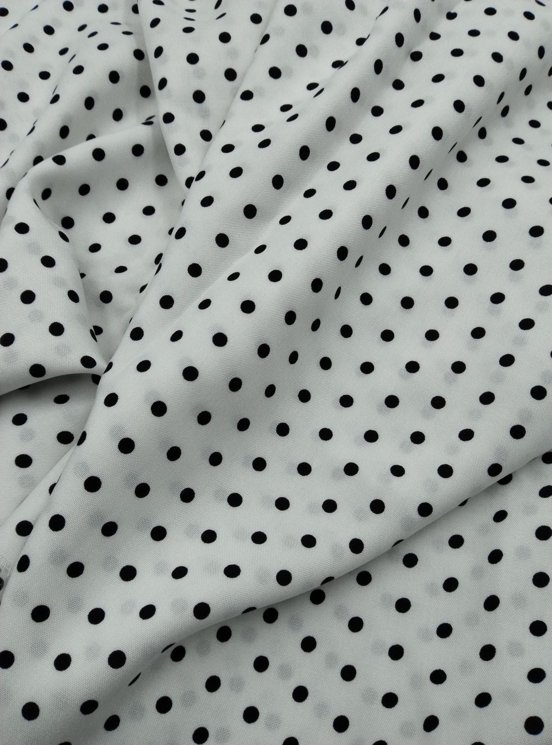 ELNA Kumaş’ın puantiyeli viskon‑pamuk karışımlı kumaşı; klasik siyah puantiye baskısıyla modern ve zamansız bir tarz sunar. Hafifliği ve nefes alabilen yapısı sayesinde elbise, bluz, etek, gömlek veya tunik gibi parçalarda konfor sağlar. Drapeli dokusu kumaşa hoş bir akış katar, sıcak havalarda serin tutar.