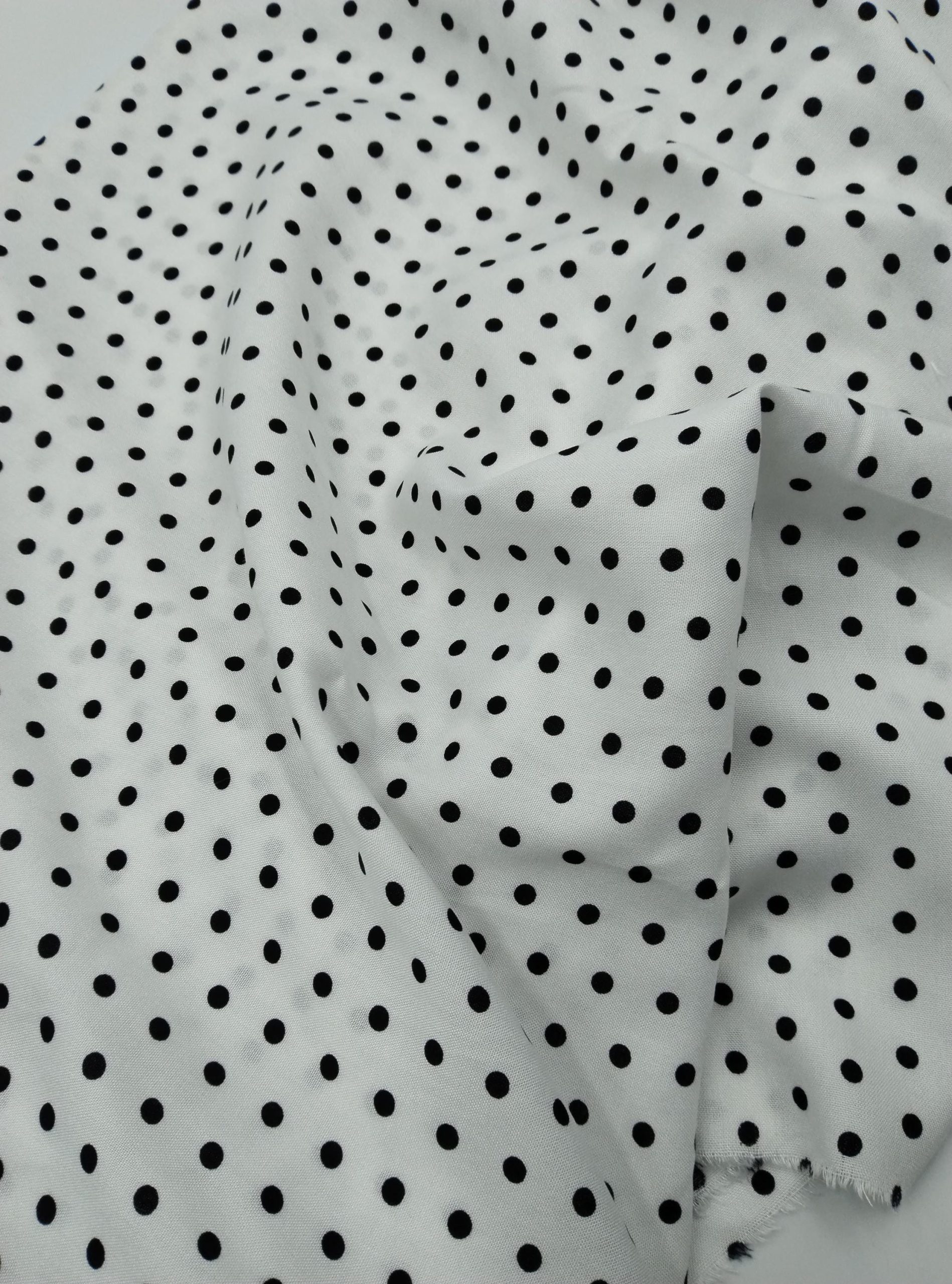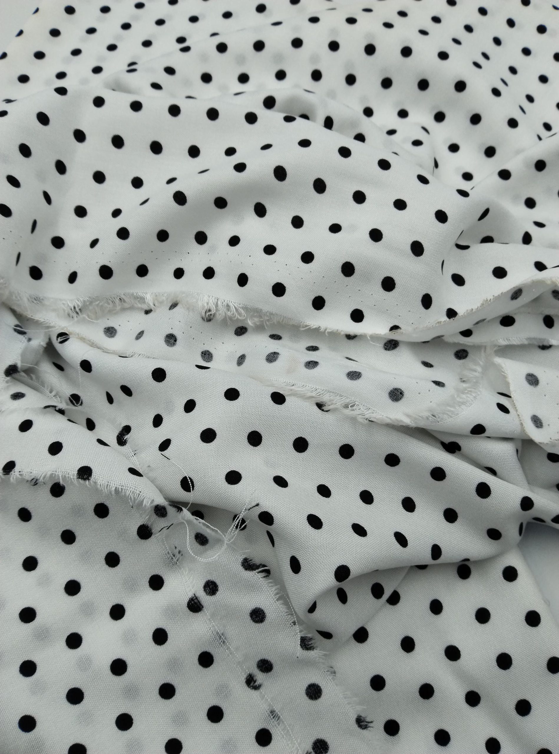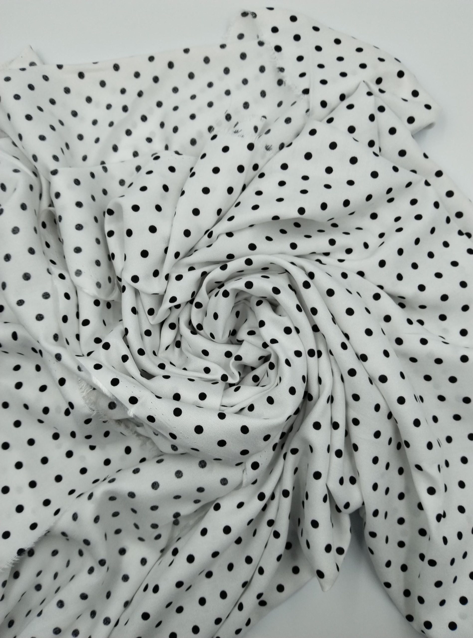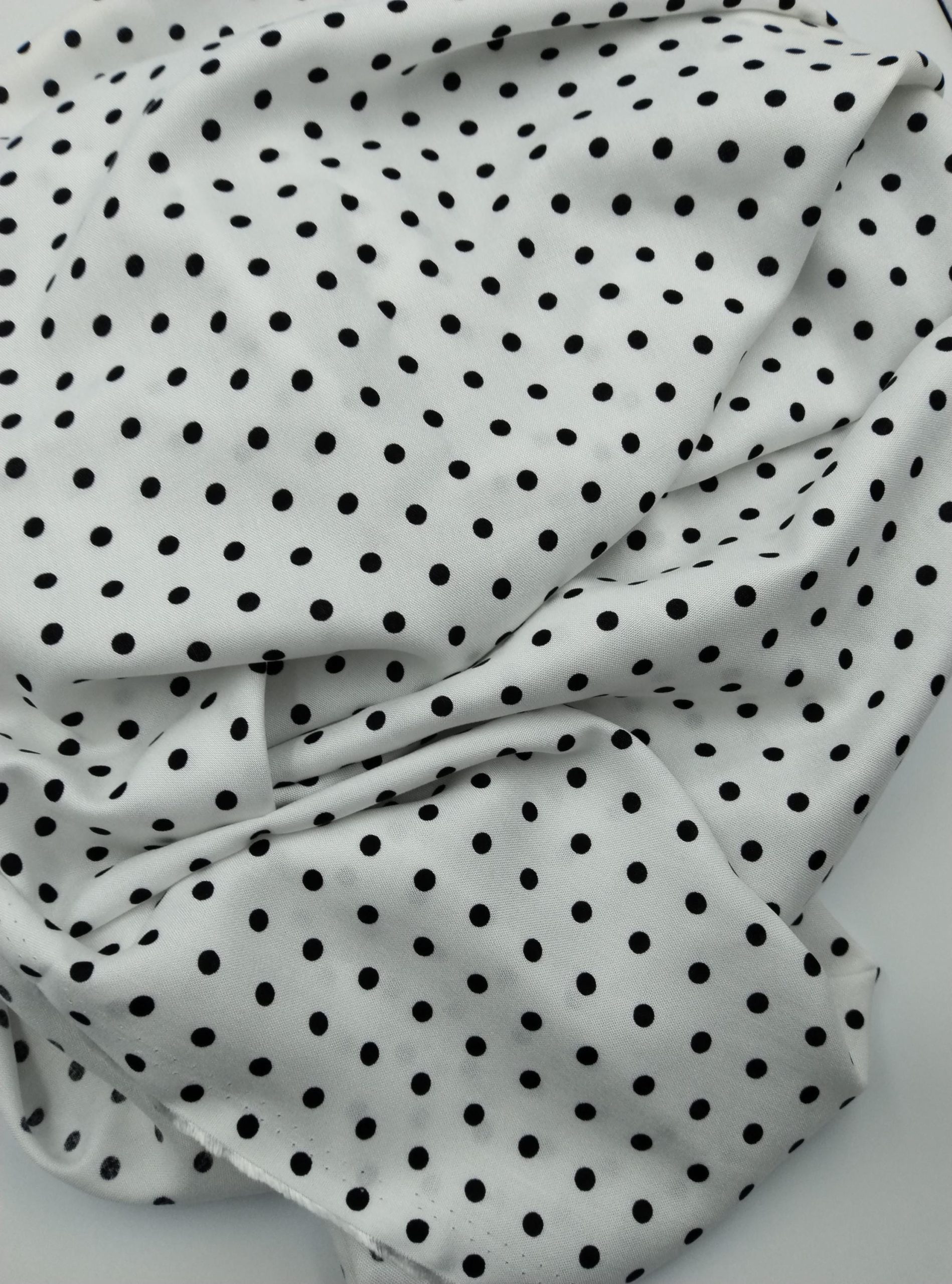 ELNA Kumaş’ın puantiyeli viskon‑pamuk karışımlı kumaşı; klasik siyah puantiye baskısıyla modern ve zamansız bir tarz sunar. Hafifliği ve nefes alabilen yapısı sayesinde elbise, bluz, etek, gömlek veya tunik gibi parçalarda konfor sağlar. Drapeli dokusu kumaşa hoş bir akış katar, sıcak havalarda serin tutar.