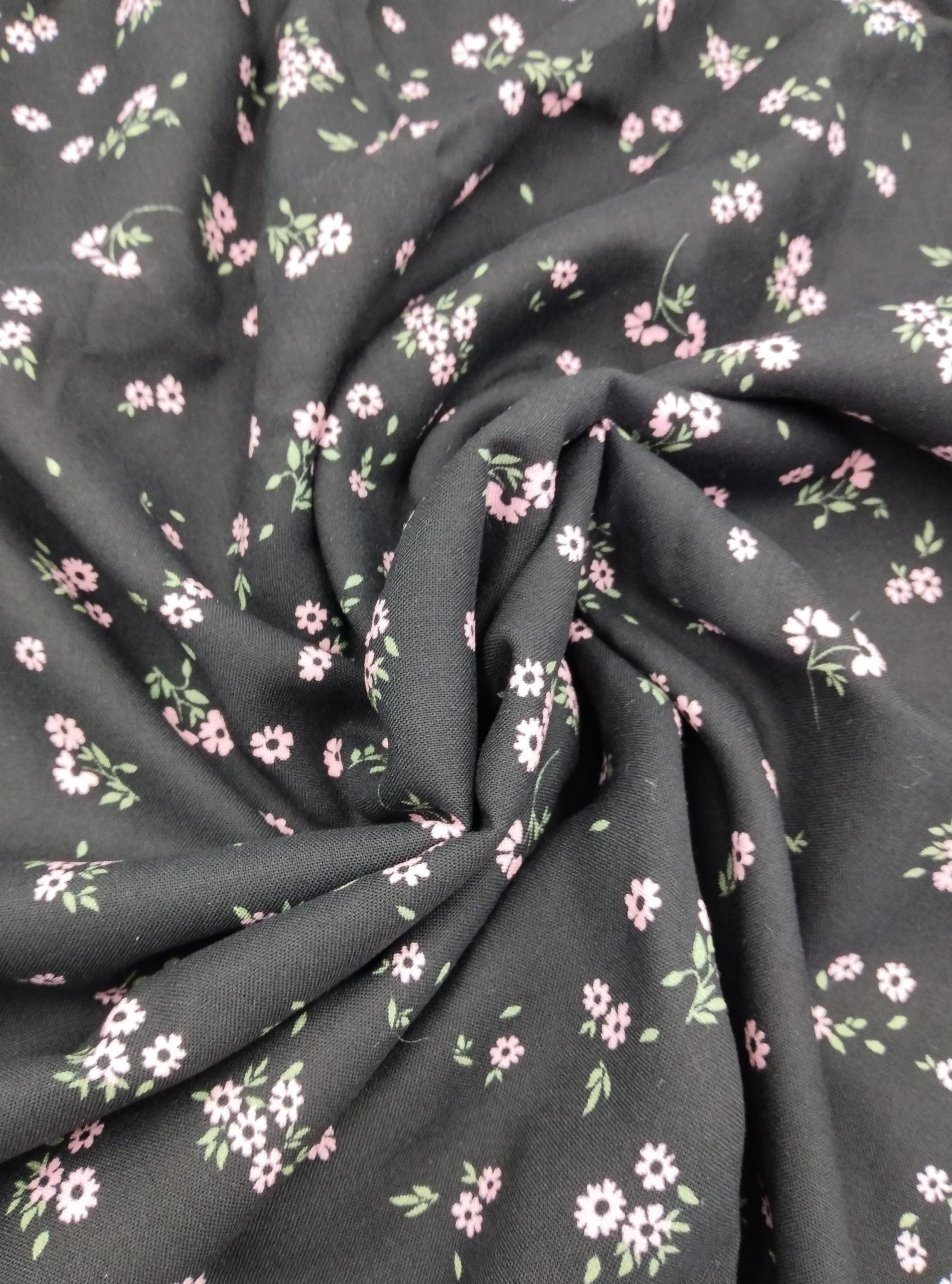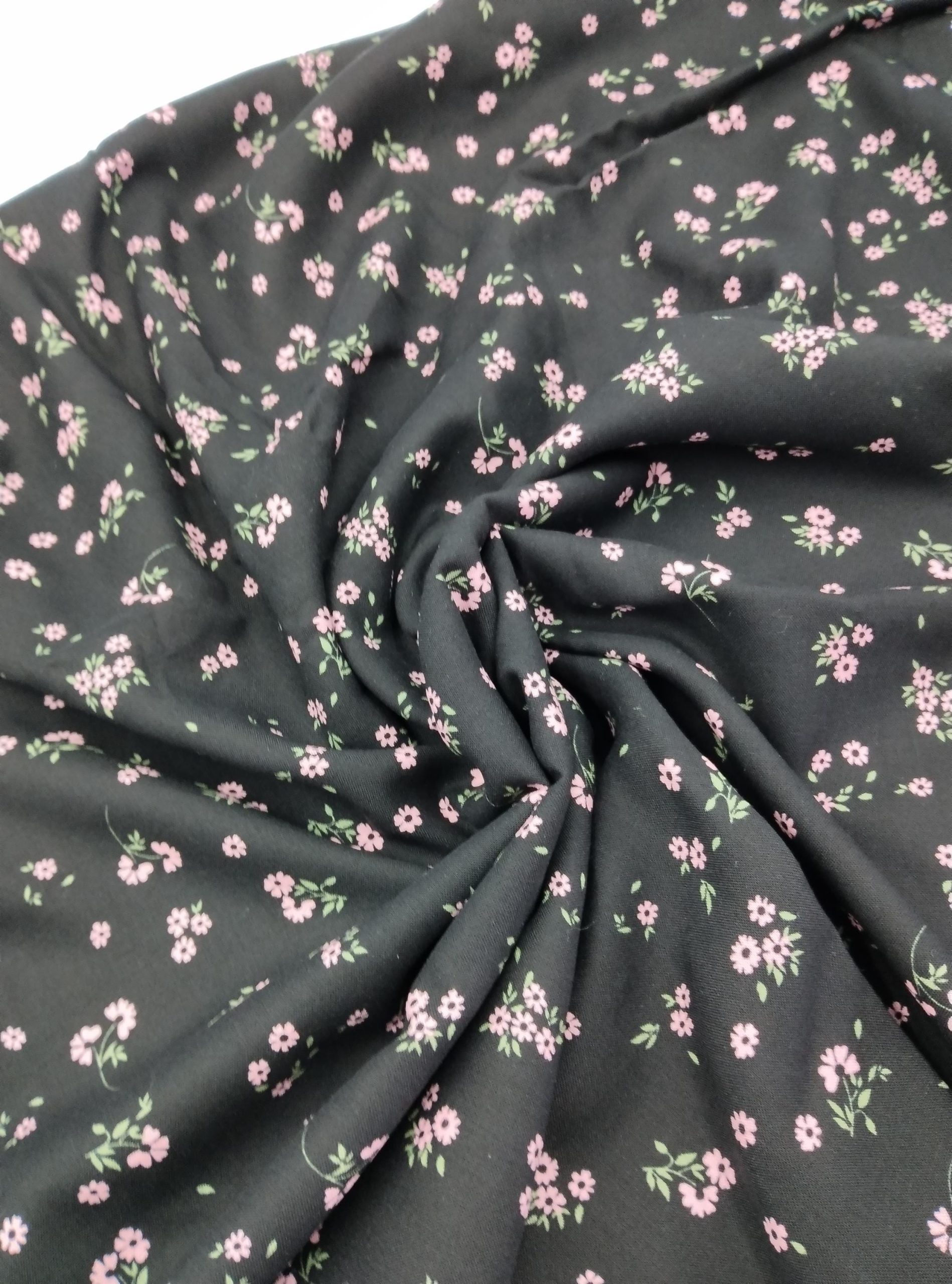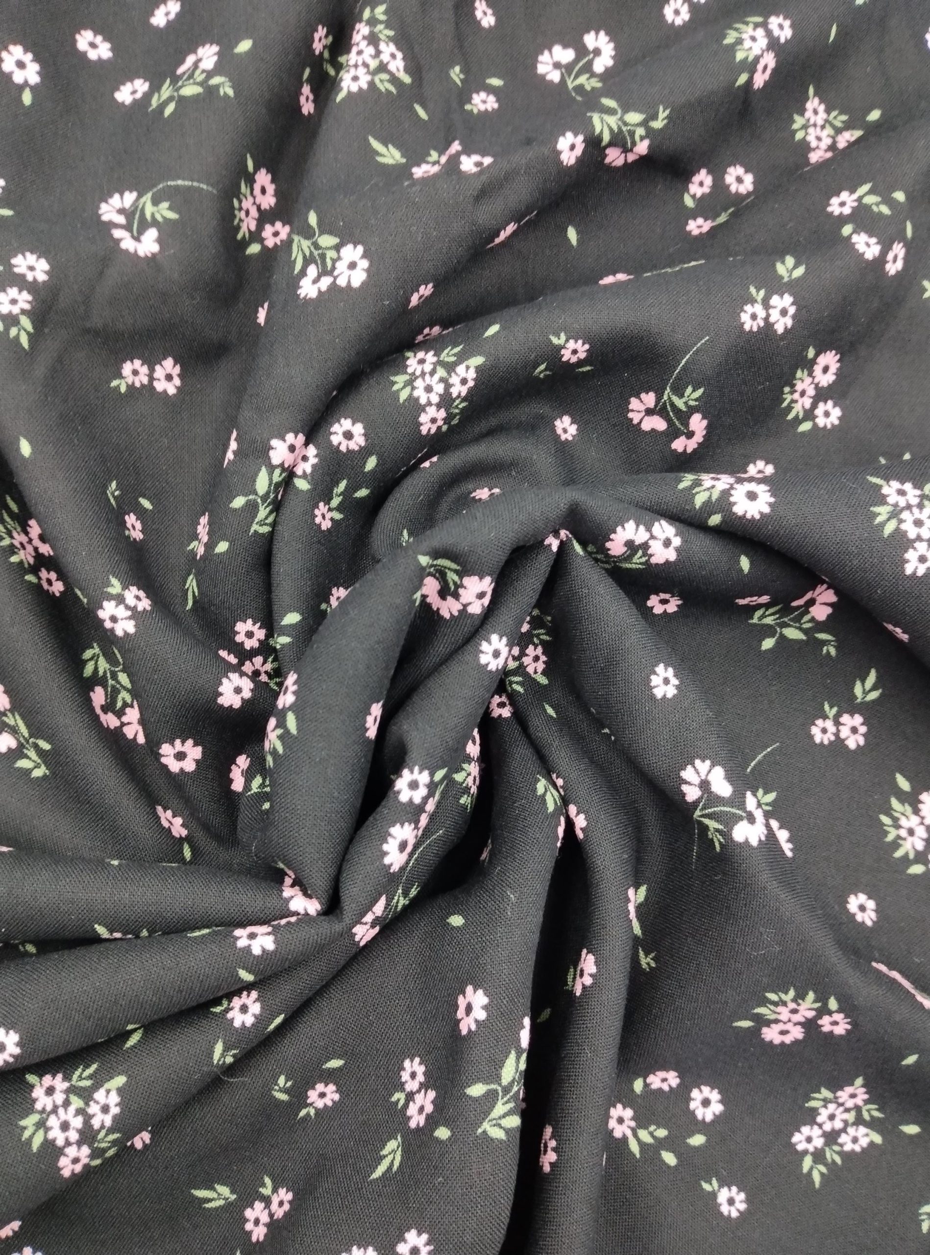 ELNA Kumaş’ın siyah zemin üzerine pembe çiçek desenleriyle tasarlanmış pamuk‑viskoz kumaşı, hem zarif görünümü hem de nefes alabilen hafif yapısıyla öne çıkar. Yumuşak dokusu, dökümlü akışı ve nefes alan yapısıyla elbise, bluz, etek, kimono gibi projeler için ideal tercihtir. Opaklığı sayesinde astar gerektirmez; kesim ve kullanım kolaylığı sunar.